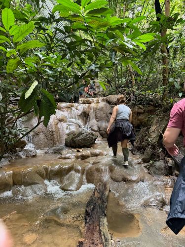 We hiked up a waterfall, called a ‘sticky’ waterfall because it is grippy rather than slippery from water/algae. The waterfall base is calcium carbonate, creating a porous material that isn’t slippery: