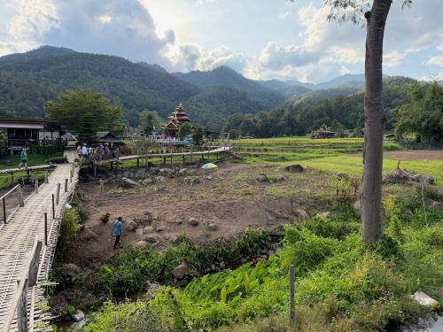Up in the mountains, there was a series of bamboo bridges walking over and between rice fields: