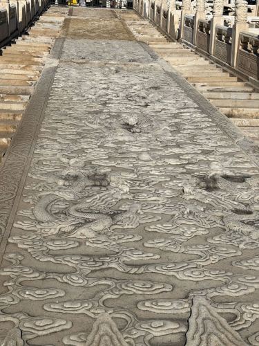 The Forbidden City was built with the Emperor as the focus. For example, the Emperor would be carried up the steps over these massive carved rock slabs: